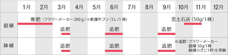 フラワーメーカーなどの配合肥料と、乾燥牛フン、堆肥などの遅効性肥料を与えます。