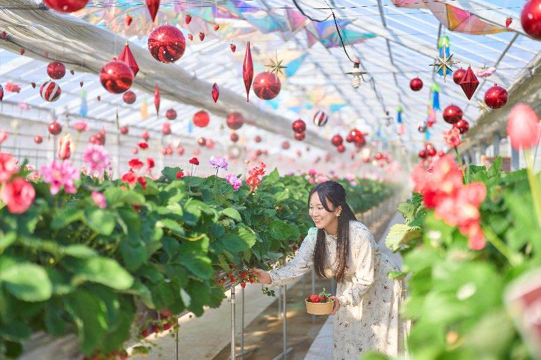 「まだ誰も見たことのない、いちご狩り空間」が好評の「オズの国のストロベリーハント」。いちごレーンの上にはいちごを模したオーナメントや16種類のデコレーションが所狭しと吊るされ、日の光を浴びてキラキラと輝きます。更に、いちごを栽培するレーンにはいちごの赤を基調とした世界中の花々が彩りを添えます。1月から春まで開催されるいちご狩りシーズンに合わせ、一足早くバラやチューリップなど500本を超えるアートフラワーが顔を出し、どこから撮影しても絵になる圧巻のアート空間の中でいちご狩り体験を楽しめます。