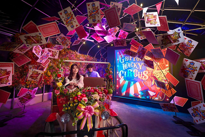 京成バラ園初の自走式ライド系アトラクションとしてデビューした、大人気アトラクションの「アリスツアーズ」が今春も再びオープンします。ゲストはドライバーのエスコートを受けながら、電動式の足漕ぎ4輪に乗り「12分間の森の探検」へ出発します。マッドハッターが準備している「森のお茶会」を見学していると、ビークルにかかってきた一本の電話をきっかけに一行は予期せぬハチャメチャな冒険へと巻き込まれてしまいます。霧のトンネルや、ドライバーの機転で始まるウォーターガンエリアでのミッション、巨大ドラゴンとの鉢合わせ、ドラゴンへの餌やり体験など、スリルと可愛らしさが満載です。「不思議の国のアリス」を原作にしたオリジナルストーリーで、キャラクターからの電話、デジタルグラフィックによるキャラクターの登場、立体的造形など、様々なキャラクター達と出会うことが出来ます。