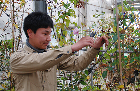バラの生産管理を担当しています。バラの水やりや施肥・剪定・誘引などの基本的な作業はもちろん、挿し木や接木などによるバラ苗の生産も行っています。