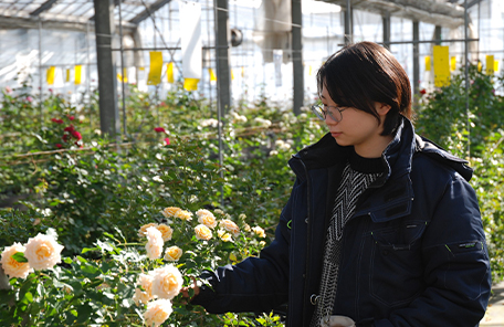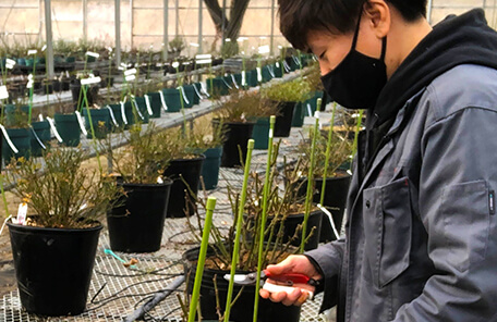 バラとペチュニアの新品種開発を担当しています。新品種は、有用な形質を引き継がせる「交配」を行って種子を形成させ、後代の中から有用な形質を選び出す「選抜」を行うことで生まれます。交配は膨大な数の手作業となるため年間を通して大変な作業となり、また選抜も有用か否かを判断するため商品化を左右する重要な業務であり、開発の責任を感じながら業務を遂行しています。また、当社の企業理念を体現するための一つとして、海外向けにも品種開発をしており、現地に赴き日本とは違う環境下での生育状態を調査し現地の会社と情報交換を行うことで海外での商品化も行っています。