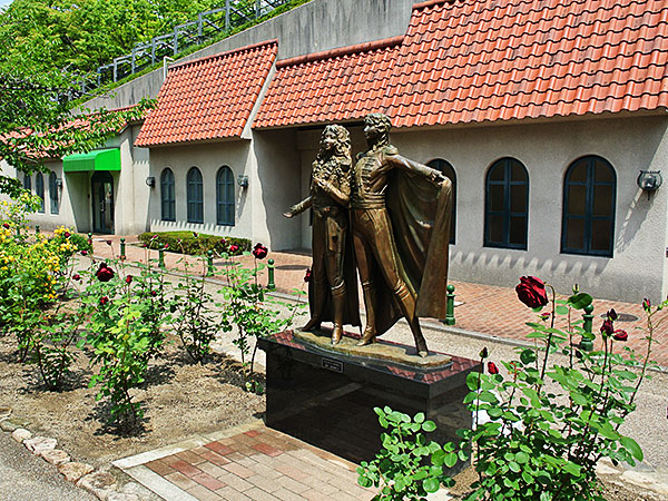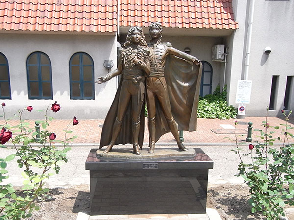 宝塚大劇場横の“ベルサイユのばらモニュメント”の周囲に「咲き誇る使命」を受けた14株のバラ。