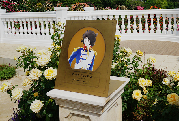 「ベルサイユのばら®」シリーズ6品種のバラと、オスカルとアントワネットの等身大パネルが設置されています。