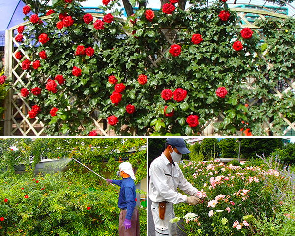 作業は、植栽・剪定・寒肥・病害虫防除・花がら取り・つるバラ整枝誘引など。年間管理もできます。