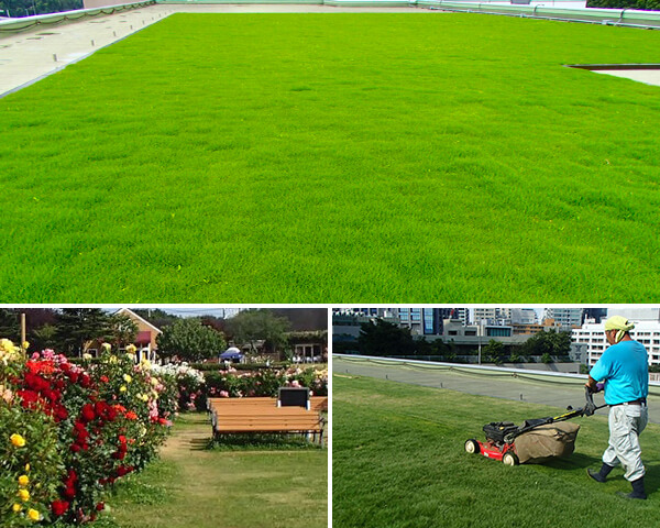 作業は、芝刈り・病害虫防除・施肥など。きれいな芝生を維持します。
