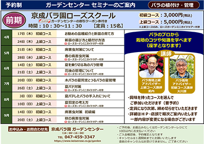 Advanced course 5,000 yen (tax)Time: 10:30~11:30 Place: Garden centre or Rose room *Please arrive 10minutes before the seminar starts Capacity: 15 people per class Instructor: Senior Advisor to Rose Cultivation Takeuchi Advisor to Rose Cultivation Ogawara How to apply: Garden centre cash register or via phone Detailed Information below