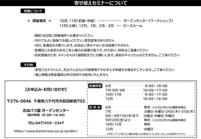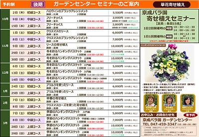 (10/9・15、11/29・30、12/14、3/8・28・29)※セミナーの内容により開催回、終了時間が異なります 会場: ガーデンセンターもしくはローズルーム