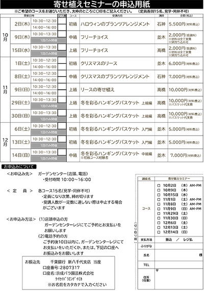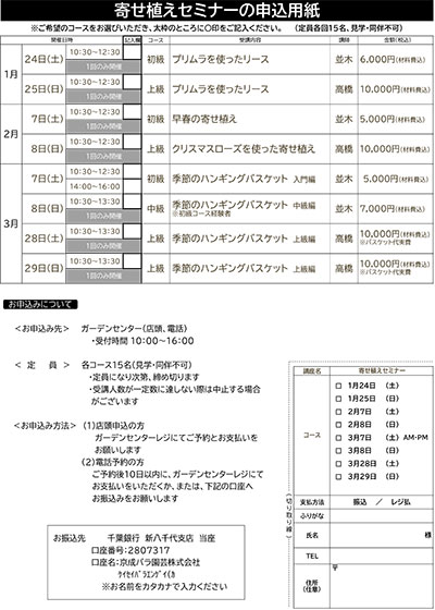 - ご予約後、ガーデンセンターレジ、またはお振込みにて、10日以内に受講料をお支払いください