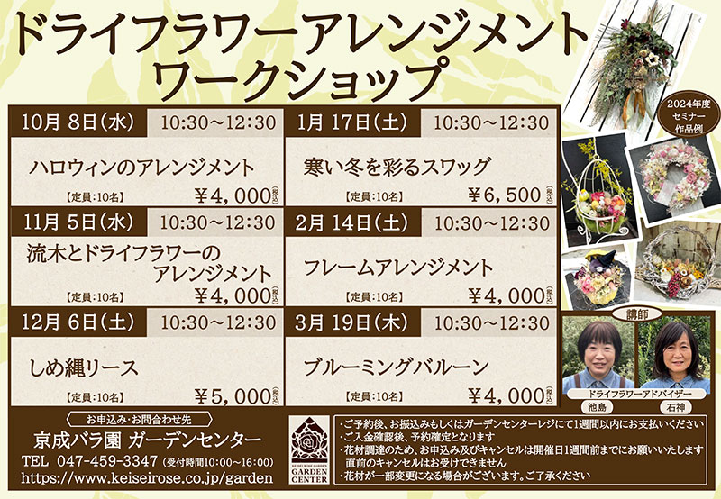 京成バラ園オリジナルのドライフラワーを使った、素敵なアレンジメント制作のワークショップですドライフラワーアレンジメント・ワークショップの申し込み受付中です
