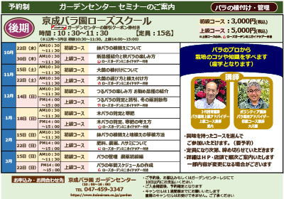 ※開始10分前に会場へお集まりください定員: 各回15名 講師: バラ栽培上級アドバイザー 武内 バラ栽培アドバイザー 大川原 お申込み: ガーデンセンターレジ、又は電話での受付となります お申込み詳細はコチラ